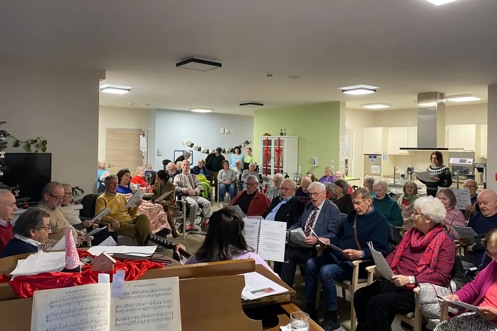 Das Betreuungsteam hatte gemeinsam mit Sängern des ehemaligen Gesangvereins Kehl-Sundheim zu diesem Liedersingen eingeladen. Zahlreiche Bewohner wie auch Angehörige waren dieser Einladung gefolgt. Die vielfältige Weihnachtsdekoration mit dem bunt geschmückten Christbaum ließen den Wohnbereich im Erdgeschoss in einem besonders weihnachtlichen Ambiente erstrahlen.